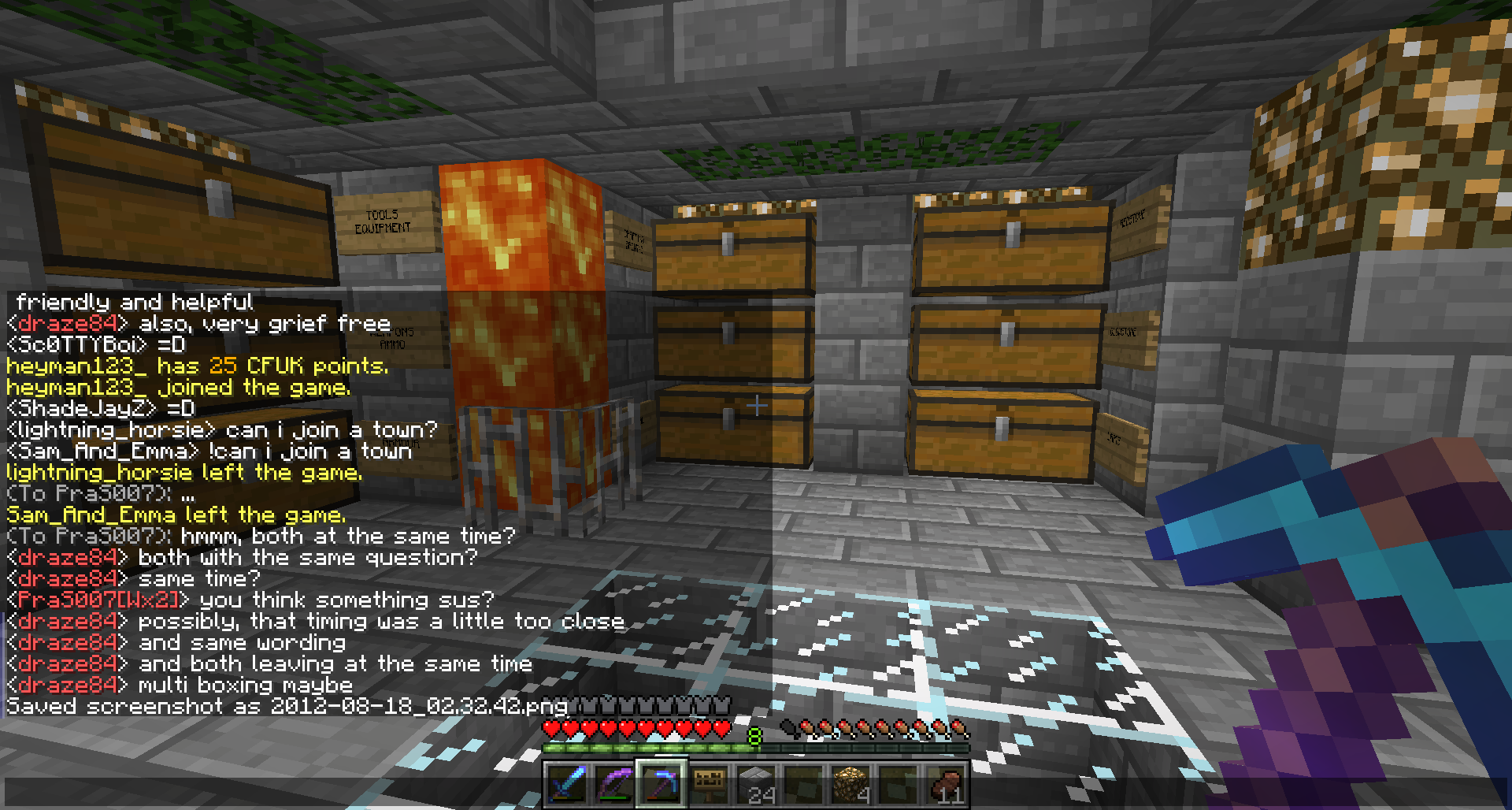The spawn ship in waterworld was suddenly missing it's mast and a glowstone. Without light and wind she sat patiently waiting for Adrenalynnn, Kobey683 and Draze84 to repair her and restock her lifeboats.
